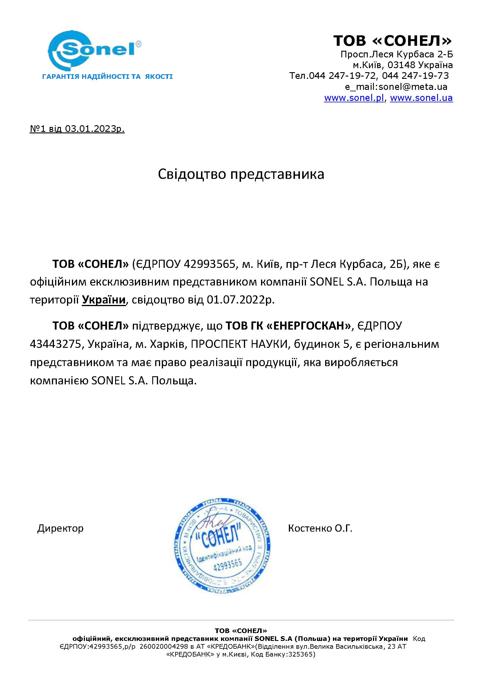 Сертифікат дилера SONEL